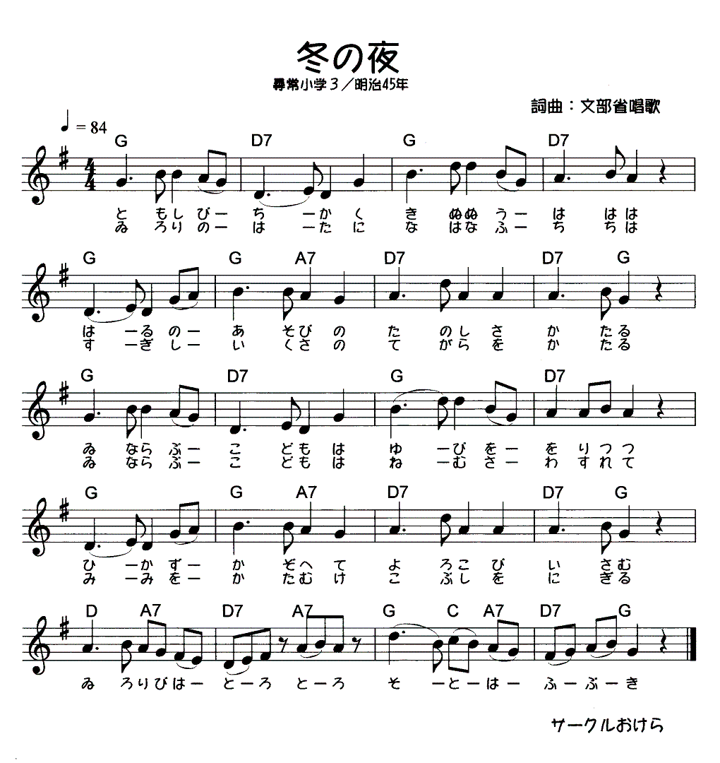 燈火(ともしび)近く 衣(きぬ)縫う母は 春の遊びの、楽しさ語る。 居並(いなら)ぶ子どもは 指を折りつつ 日数(ひかず)かぞえて 喜び勇む ■囲炉裏火(いろりび)はとろとろ 外は吹雪 |