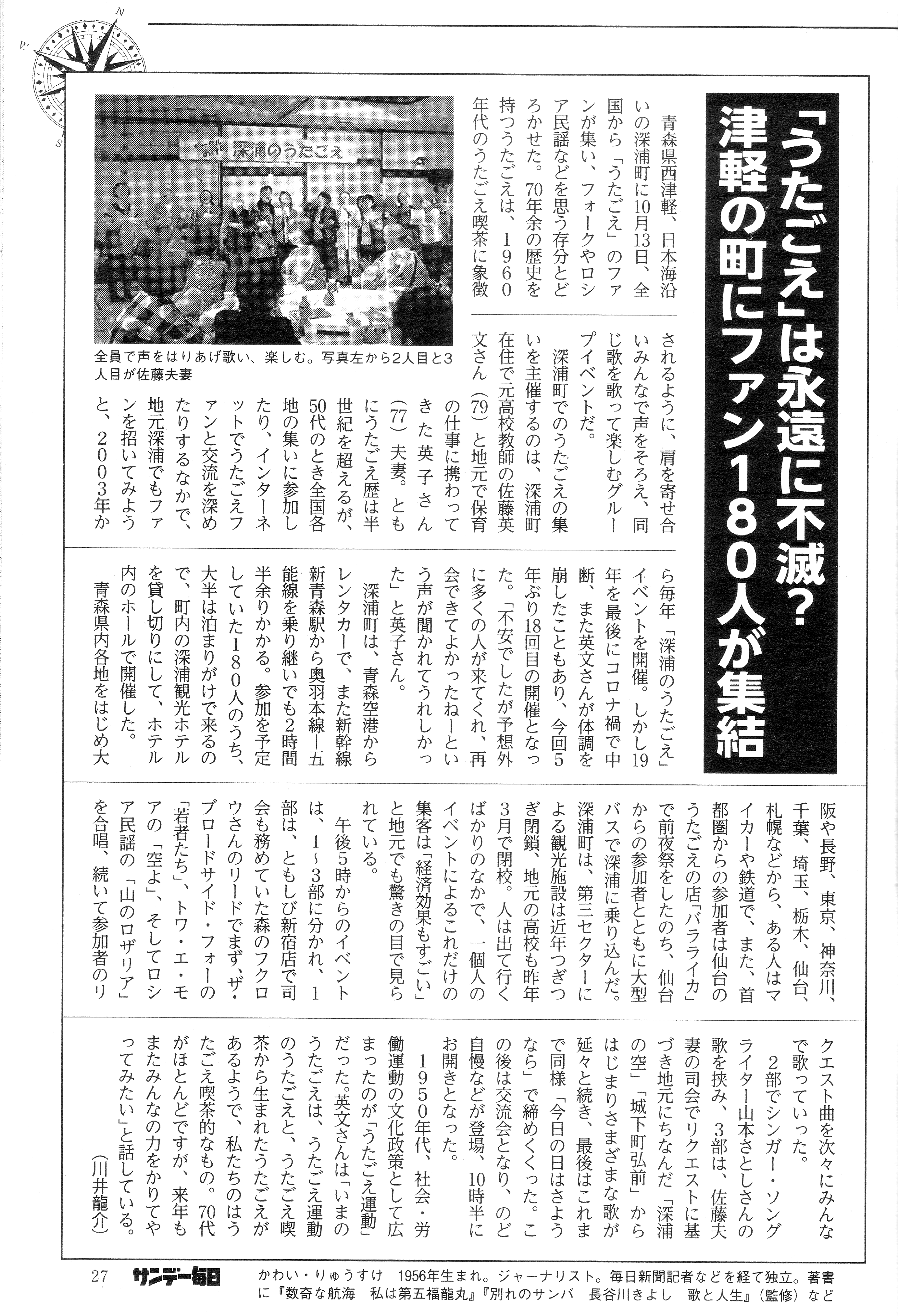 ■去る10月13日、「深浦のうたごえver2024」を開催しました。 ■その時の様子を、サンデー毎日が、「うたごえは永遠に不滅?」というタイトルで掲載(2024/11/10)してくださいましたので、みなさまにも紹介したいと思います。 ■記事をクリックすると大きくなりますので、拡大してご覧ください。 (^-^)